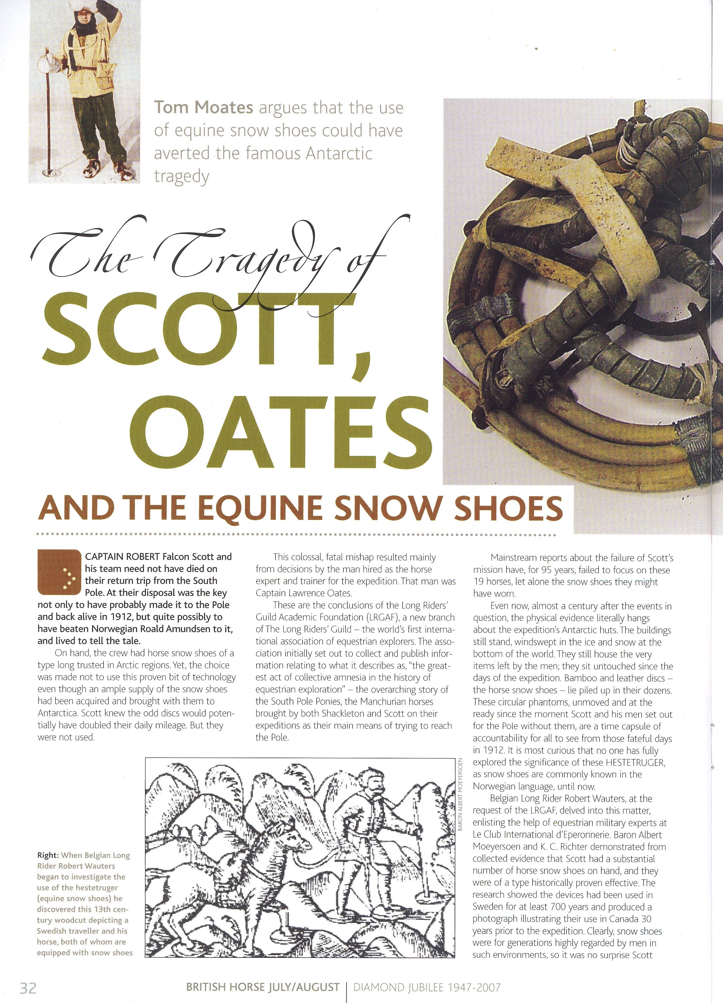 The British Horse Society magazine breaks the news! The Tragedy of Scott, Oates and the Equine Snow Shoes - could the use of equine snow-shoes have averted the famous Antarctic tragedy? Click on images to enlarge, or click here for a version in PDF.