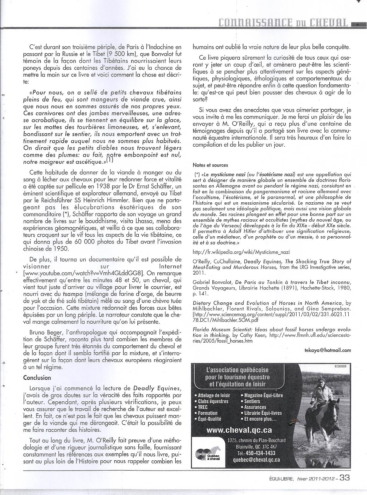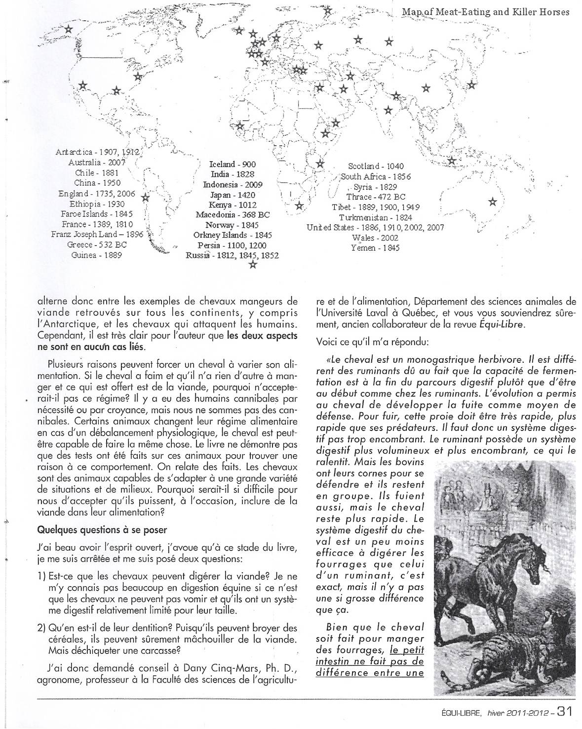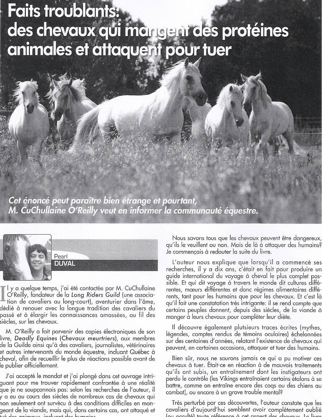 An excellent article has been published in Équi-Libre, Canada's leading equestrian magazine published by the association of Québec à Cheval in Canada. Pearl Duval, the author, admits that when she started reading Deadly Equines she had grave doubts but, after consulting scientists in Canada, now readily accepts that horses can indeed eat meat and some may be aggressive. Click on images below to read the article (in French). To read an English translation, click here.