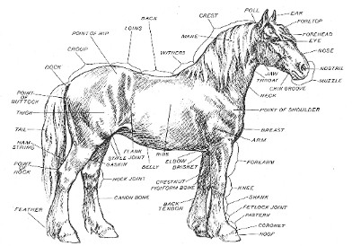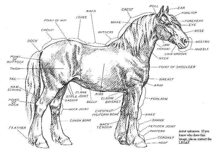 made into a feature film. Sadly, many writers either think they know more about horses than they do, or they simply guess when it comes to horses. In Hollywood and in too many novels nobody walks a horse. They leap on and gallop away, and hours later, when a real horse would be crippled up or buzzard bait, they are still tearing along the trail, their super steeds not even slick with sweat. But I think my pet peeve is when I read about a character who, never having ridden before, mounts up and is suddenly riding like an expert, tearing across the landscape bareback at a full gallop, leaping fallen trees and ten-foot ravines, outrunning helicopters or motorcycles or bad guys on black stallions. Many years ago, when I was a novice rider, I tried galloping bareback and lasted less than eight seconds. As with anything else, if you want to write about horses accurately, your characters need to ride at their level of experience and skill. When I wrote my novel Thunderhead, I had a lot of fun putting inexperienced riders on horses and watching them get joggled around, fall off, or turn their saddles upside down because they forgot to tighten their cinches. As fiction writers, we cannot be experts in everything we write about. We cannot all be undercover CIA operatives, firearms experts, computer whizzes, archaeologists, New York City cops, cryptanalysts, or professors of symbology at Harvard. Nor can we all be expert riders. That is why research is so important. Equine Anatomy