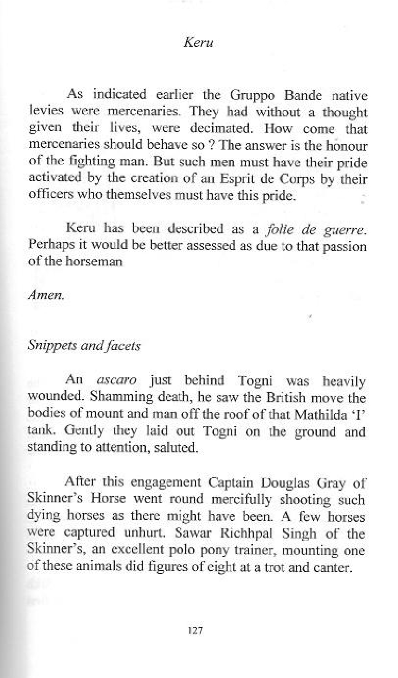 Editorial Note - from CuChullaine O’Reilly In 2010 I began work on the "Encyclopaedia of Equestrian Exploration." It was while I was doing research for that project that I began corresponding with Tootoo Imam. A legendary rider and author of exemplary books, Tootoo’s knowledge of equestrian history was astonishing. Because of our mutual interest in equine history, he and I began exchanging lengthy emails on a regular basis. This correspondence continued for years. In 2013 Tootoo wrote to ask the LRG Press to assist him in making the historical information in his books more widely attainable to an international audience by publishing extracts from his books on the Guild’s Academic Foundation website. Sadly he passed away in 2018 at the age of 97, before we could begin to honour that promise. Tootoo was not only a knowledge keeper. It was thanks to his generosity of spirit that so much tremendously valuable equestrian wisdom was preserved for posterity. In addition, his love of horses brought him into contact with many of the most noted equestrians of the 20th century. One such extraordinary meeting occurred in 1990 when the Indian historian met Italy’s most famous mounted warrior, Baron Alfredo Guillet, in Ireland. Known as the Italian "Lawrence of Arabia", Guillet and his African cavalrymen charged British tanks armed with only swords, guns and hand grenades. During a remarkable meeting, the Baron recounted the battle to Tootoo Imam.