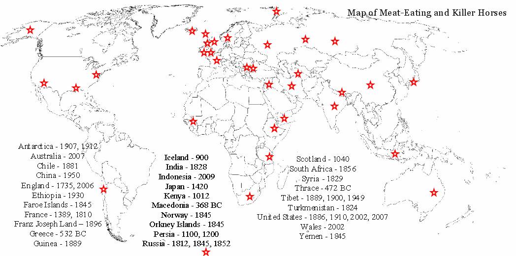 What has been overlooked is that mankind has known about meat-eating horses for at least four thousand years, during which time horses have consumed nearly two dozen different types of protein, including human flesh, and that these episodes have occurred on every continent, including Antarctica.