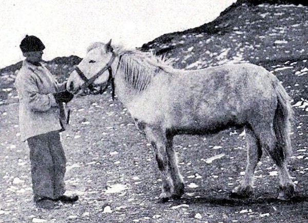In his book, Jackson recalled how one of these animals, a mare named Brownie, “appears to be doing very well on her miscellaneous diet. In addition to her regular feed of Spratt dog biscuits and hay, she shares the scraps left from our meals with the dogs, and very frequently helps herself to their polar bear meat, and shows a fondness for picking at bird skins lying around the hut.” (A Thousand Days in the Arctic by Frederick George Jackson, 1899.)