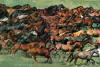 Thanks to this canine onslaught, one week in August was declared “Ken-L-Ration Week” and more than four million dogs were being fed horse meat via 150,000 stores across the nation. Chappel’s network expanded rapidly into a wide-open market and Ken-L-Ration became an international power in the dog food business. The Rockford plant covered 23 acres, employed 600 men, was posting a profit of $500,000 a year and had soon drained the Midwest of every available horse. “When Chappel got done around here, it was as dry of horse flesh as a rum bottle on a navy boat. That’s when he turned to mustang meat.” Unless you’re 150 years old, you probable don’t recall how long America has had a love-hate relationship with mustangs. Cattlemen in particular loathed the sight of feral horses, which consumed range grass and drank precious water. As early as 1824 the problem was so great the government held round-ups to kill unbranded horses. When gold was discovered in California in 1849, cattle increased in value, so thousands of wild horses were driven off the Santa Barbara cliffs into the sea.